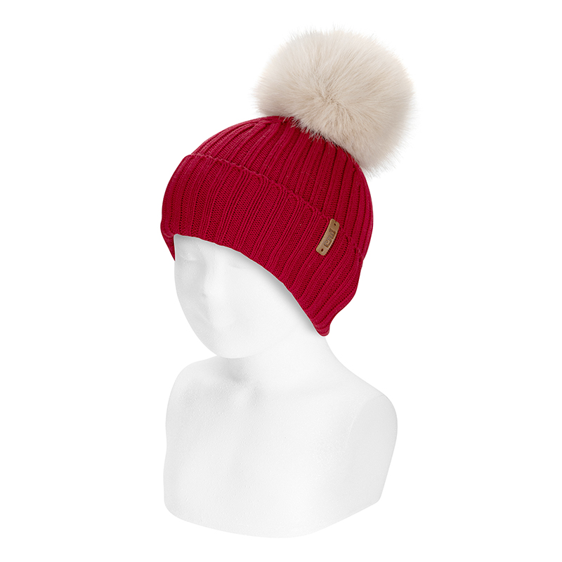 Gorro de canalé con vuelta y borla de pelo sintético.