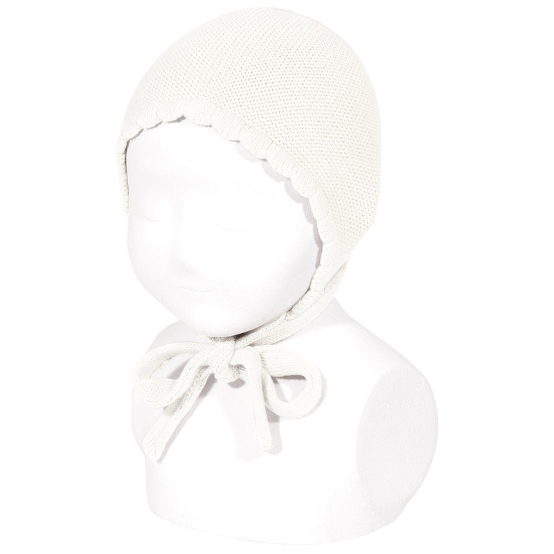 Cuello de punto links calado para bebé. Abrochado con botón de madera.