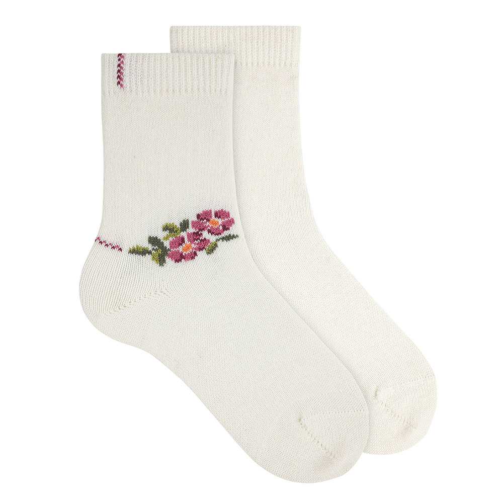 Calcetines cortos en lana merino mezcla con flor bordada. Tallas infantiles de 2 a 10 años.