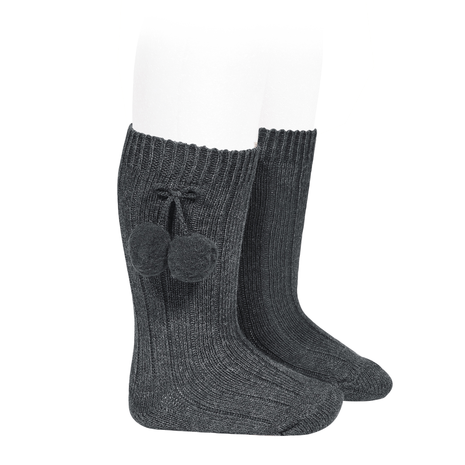 Calcetines altos de algodón cálido, largos por debajo de la rodilla y canalé con borlas a tono. Disponibles en tallas de 000 a 8 años.