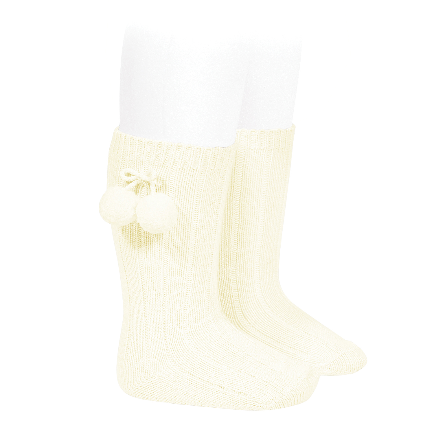 Calcetines altos de algodón cálido, largos por debajo de la rodilla y canalé con borlas a tono. Disponibles en tallas de 000 a 8 años.