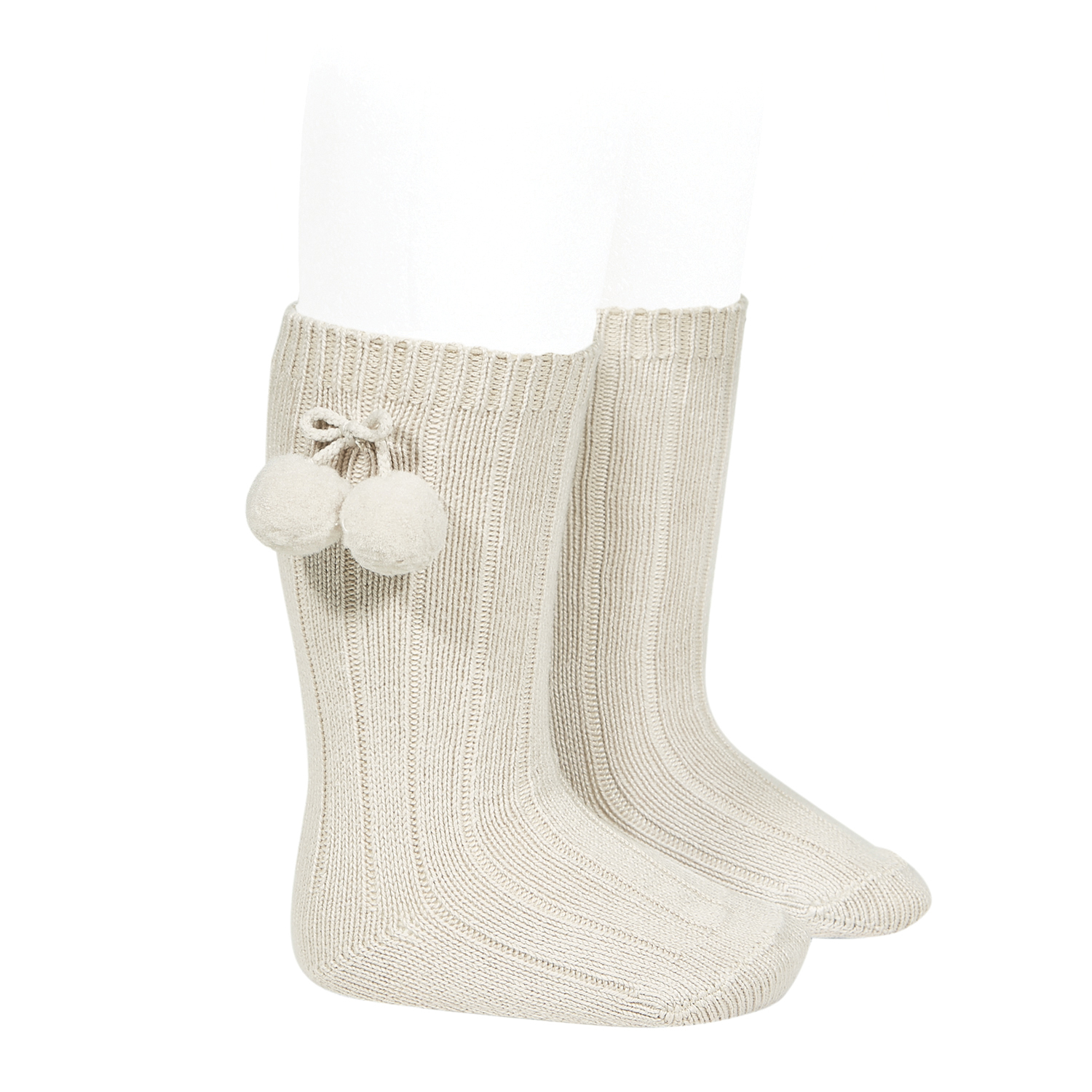 Calcetines altos de algodón cálido, largos por debajo de la rodilla y canalé con borlas a tono. Disponibles en tallas de 000 a 8 años.