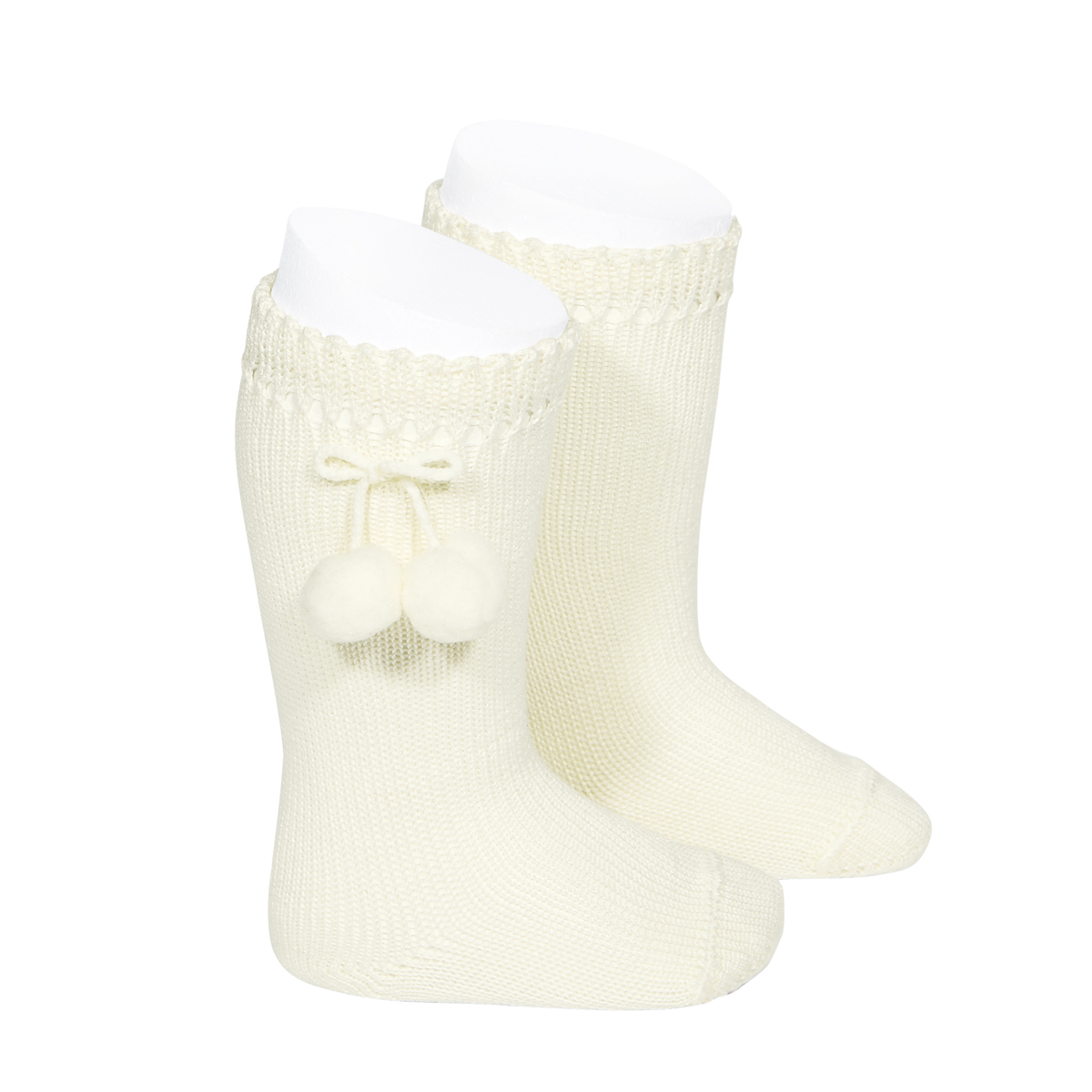 Calcetines altos para bebé fabricados en 100% algodón perlé con borlas a tono. Disponibles en talla 000 de (0-3 meses) a 4 años (23-26).
