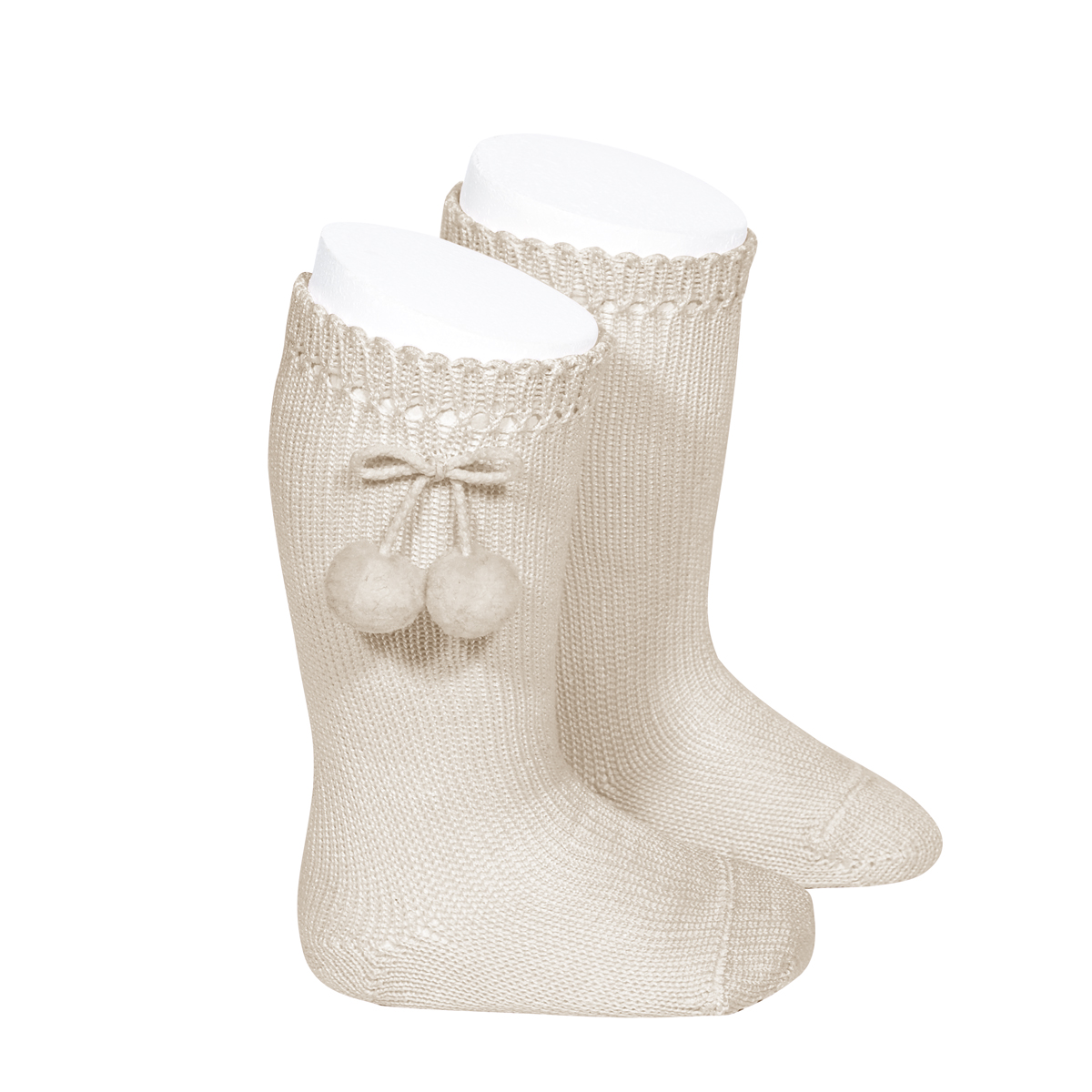 Calcetines altos 100% algodón de perlé calado en el lateral y pompón en el puño. De 3-6 meses a 6 años.