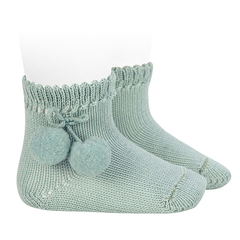 Calcetines altos para bebé fabricados en 100% algodón perlé con borlas a tono. Disponibles en talla 000 de (0-3 meses) a 4 años (23-26).