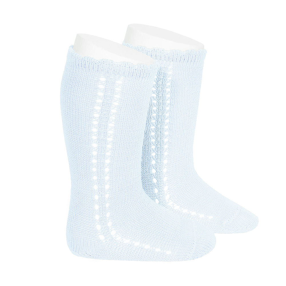 Calcetines altos por debajo de la rodilla 100% algodón perlé para primavera con detalle calado en el puño. Disponibles en tallas de bebé de 3-6 meses a 6 años.