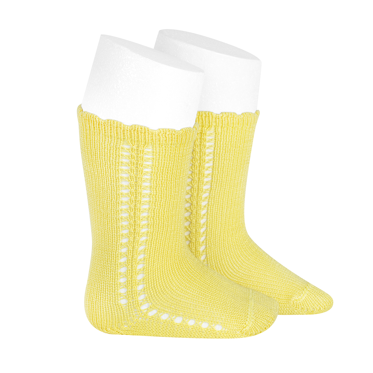Calcetines altos por debajo de la rodilla 100% algodón perlé para primavera con detalle calado lateral. Disponible en tallas de 0-3 meses a 6 años.