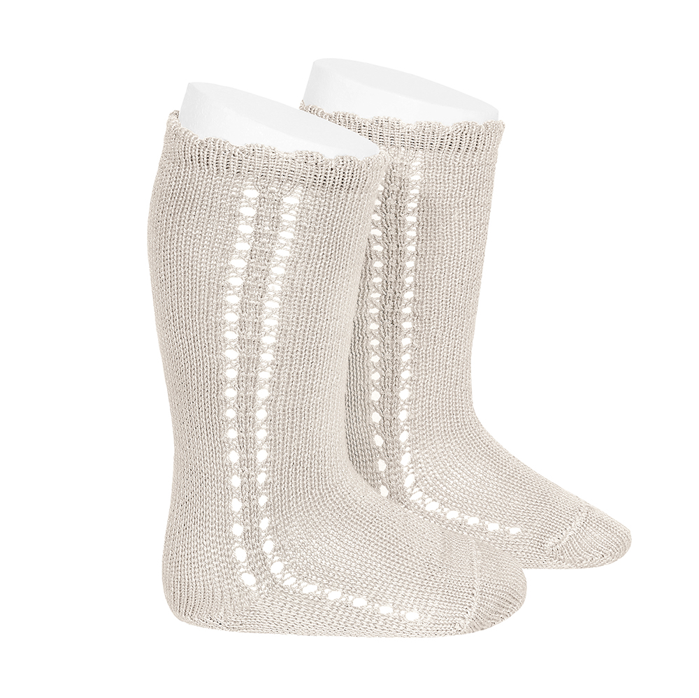 Calcetines altos por debajo de la rodilla 100% algodón perlé para primavera con detalle calado en el puño. Disponibles en tallas de bebé de 3-6 meses a 6 años.