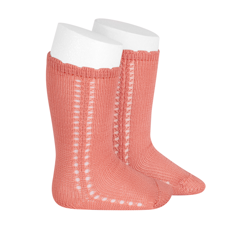 Calcetines altos por debajo de la rodilla 100% algodón perlé para primavera con detalle calado lateral. Disponible en tallas de 0-3 meses a 6 años.