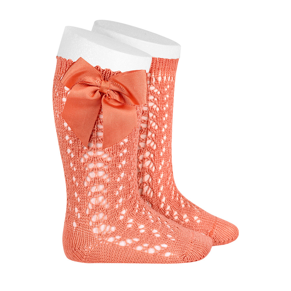 Calcetines altos calados 100% algodón perlé con lazo en el lateral. Disponible en tallas de 0-3 meses a 8 años.