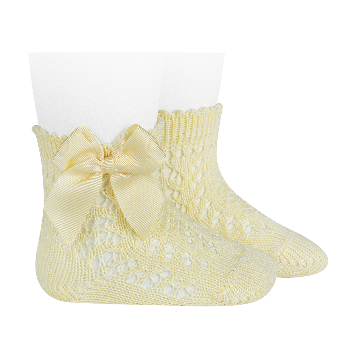 Calcetines altos calados 100% algodón perlé con lazo en el lateral. Disponible en tallas de 0-3 meses a 8 años.