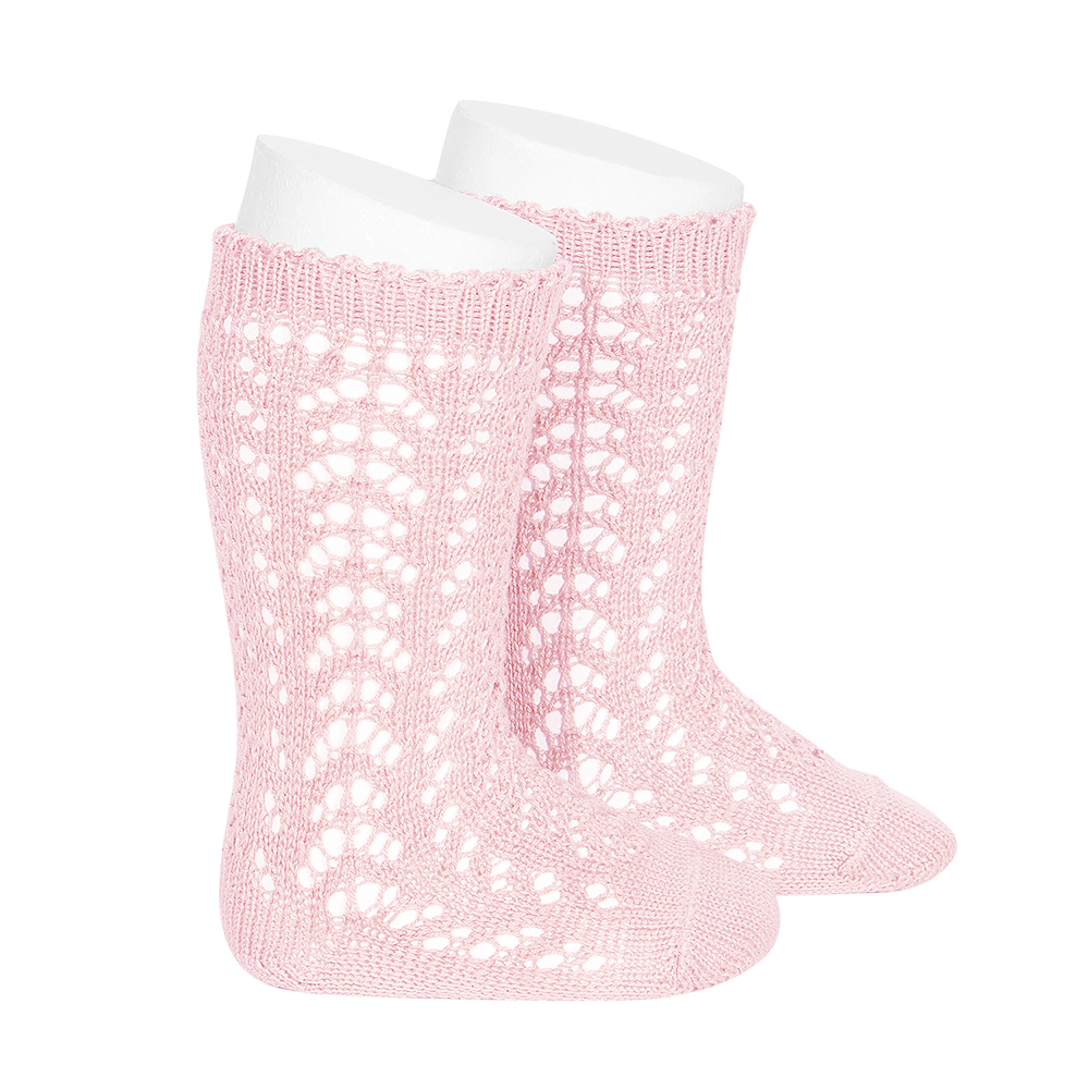 Calcetines altos calados 100% algodón perlé con lazo en el lateral. Disponible en tallas de 0-3 meses a 8 años.