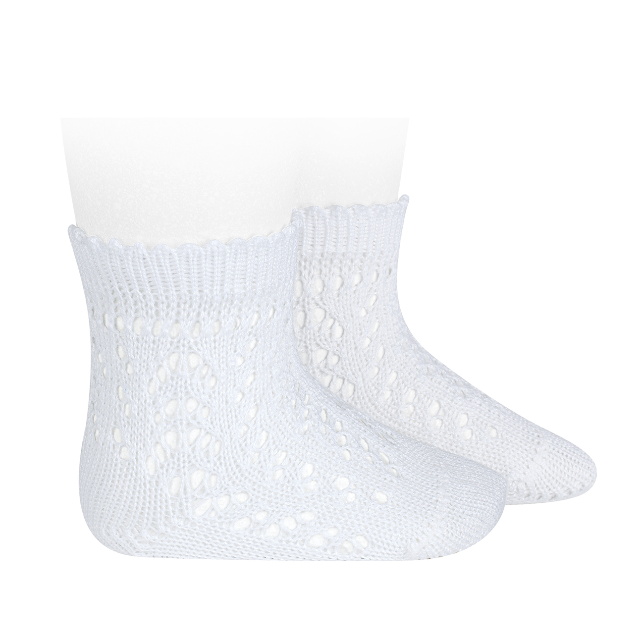 Calcetines calados de algodón perlé. Disponible en tallas de 0-3 meses a 6 años.