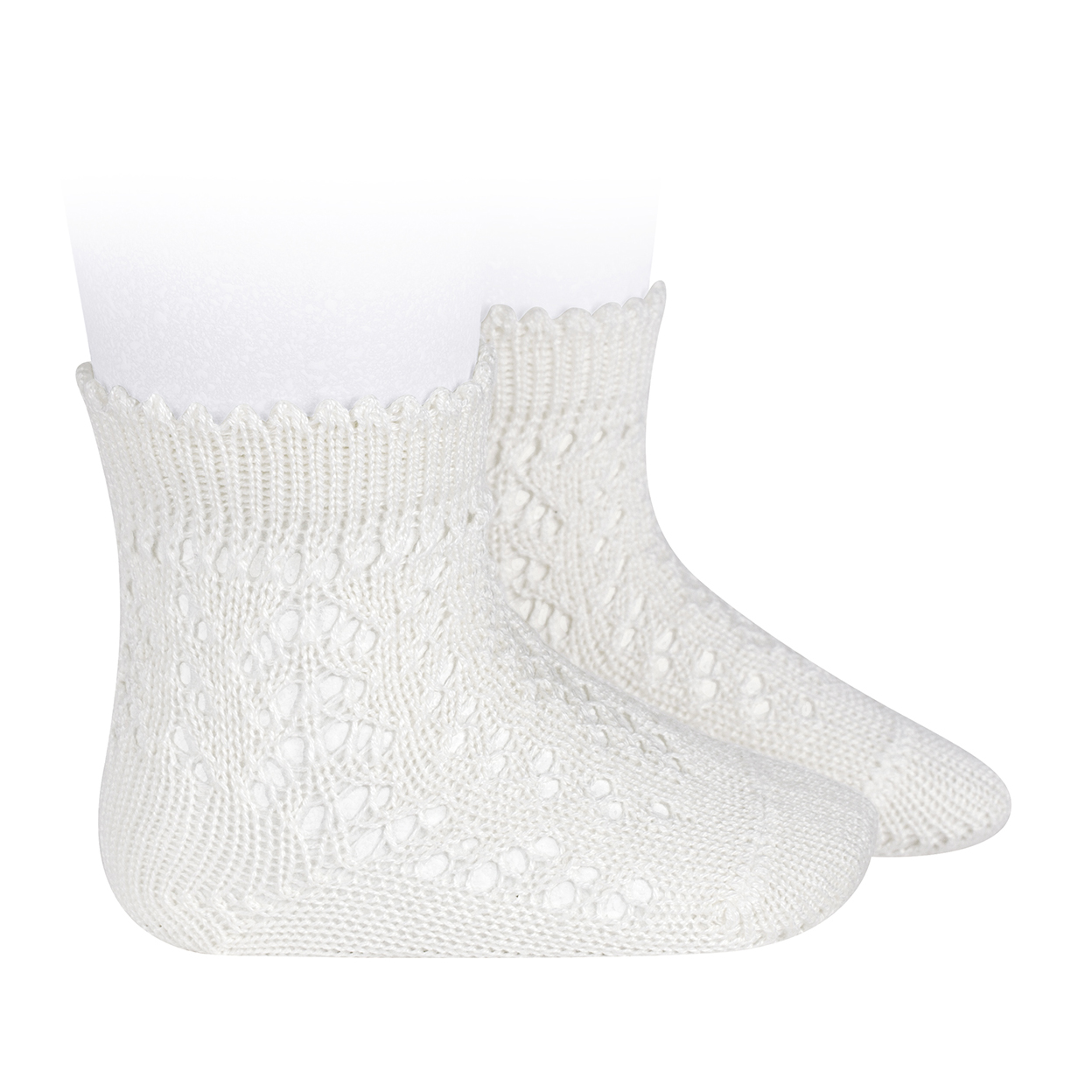 Calcetines calados de algodón perlé. Disponible en tallas de 0-3 meses a 6 años.