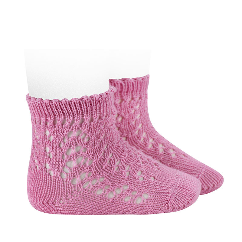 Calcetines calados de algodón perlé. Disponible en tallas de 0-3 meses a 6 años. 80% algodón 20% poliamida tallas 000 (0-3 meses) y 00 (3-6 meses) 100% algodón a partir de la talla 0 (6-12 meses) a 6 años.