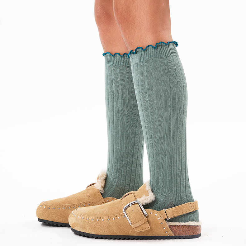 Calcetines altos canalé con curling contrastado en el puño. Tallas de 2 a 6 años.