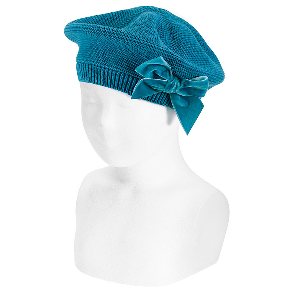 Boina de algodón en punto bobo con lazo de terciopelo. Conjúntala con los calcetines y leotardos con lazo de terciopelo.