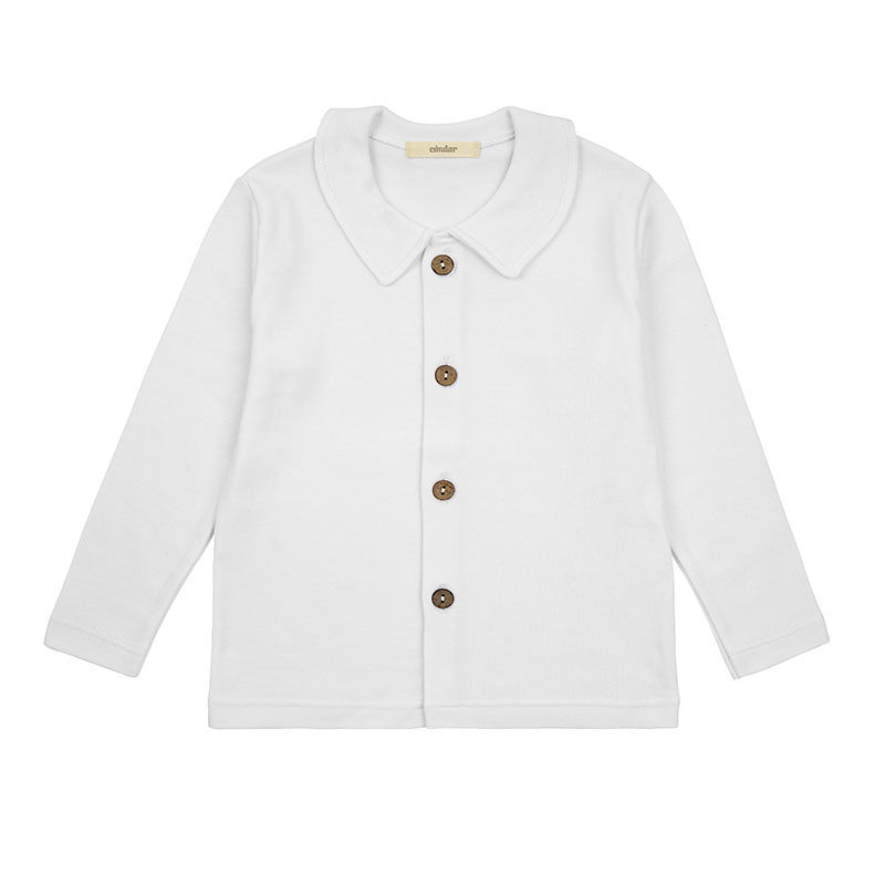 Camisa blanca de punto 100% algodón abrochada con botones frontales. Manga larga y cuello pico. Para niños de 3 a 6 años.