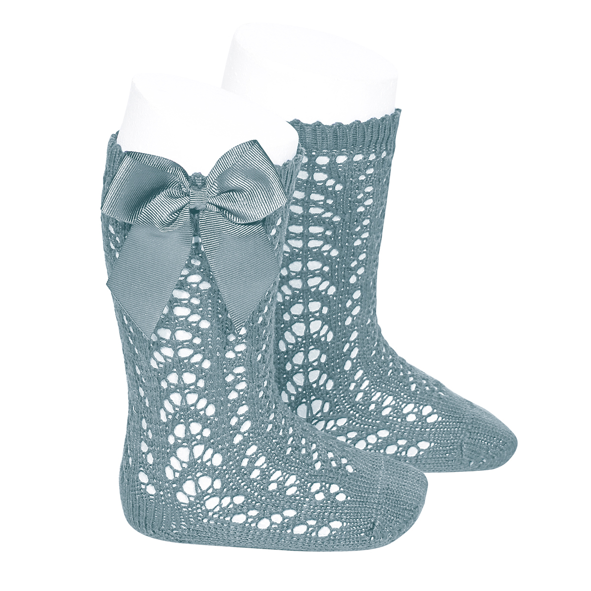 Calcetines altos calados 100% algodón perlé con lazo en el lateral. Disponible en tallas de 0-3 meses a 8 años.